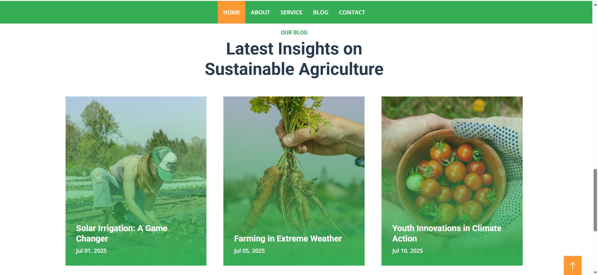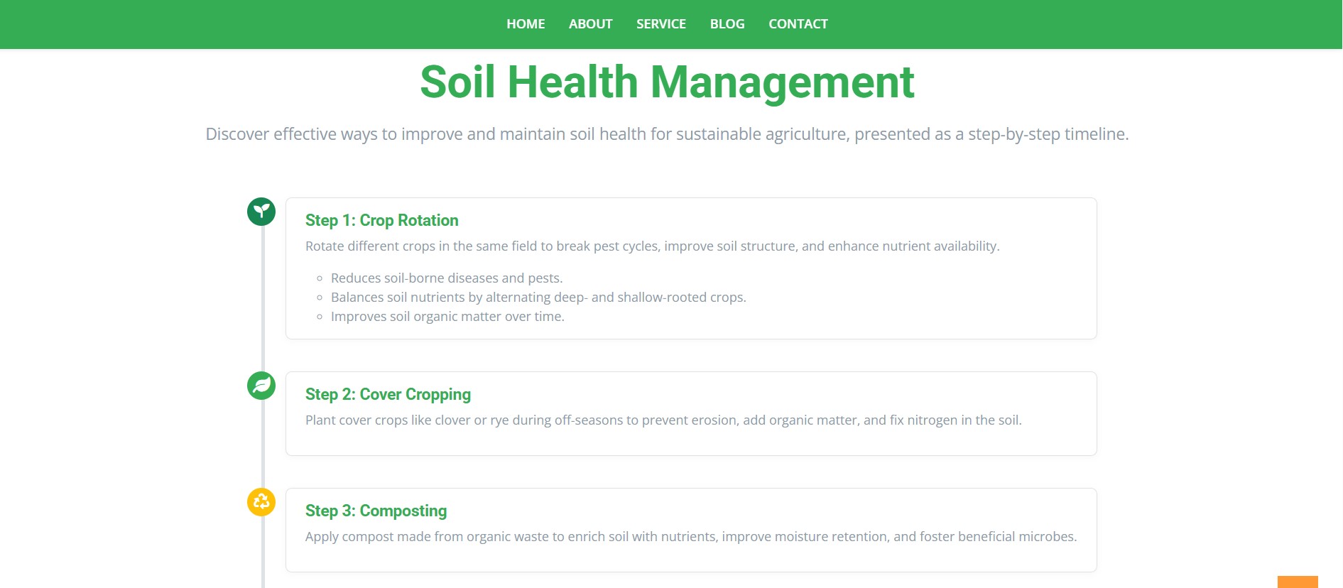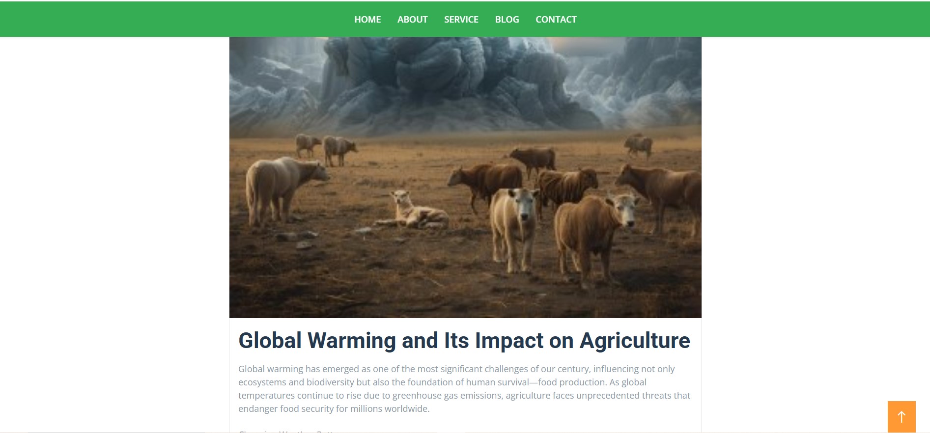 I have built this website as a comprehensive platform dedicated to promoting sustainable agriculture and environmental awareness. Through it, I provide valuable resources and information on topics such as climate change, soil health management, renewable energy, and modern farming techniques. The site features interactive educational content, blog posts managed by an admin panel, and user-friendly navigation designed for both general users and administrators. With sections like About, Services, Blog, and specialized pages for climate solutions and soil management, I aim to empower farmers, students, and the general public to adopt eco-friendly practices and stay informed about the latest developments in sustainable agriculture and environmental stewardship.